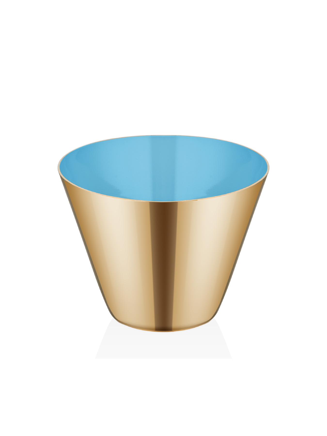 The Conical Snack Bowl in Gold Titanium & Blue by Cheffinox adds a touch of elegance to your dining presentations. Crafted from durable 18/10 Cr-Ni stainless steel, this bowl features a stunning gold titanium coating that is resistant to corrosion. Available in glossy or matte finishes, it is perfect for serving snacks in style. Hand washing is recommended to maintain its luxurious appearance.