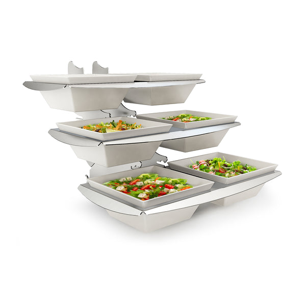 The Eagle Shelf 3 Layer 6 Slot Square Bowl is a stylish and functional display solution for any hospitality setting. Designed to elegantly showcase a variety of dishes, this metal shelf features three layers and six slots, making it perfect for buffets or catering events. Its satin finish adds a touch of sophistication, ensuring it complements any decor.