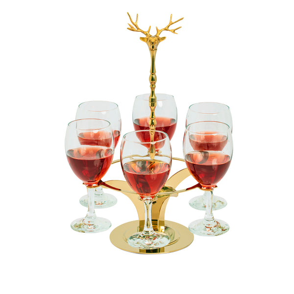 The Guren 6-Glass Presentation Stand is a stunning decorative piece designed to elegantly display six glasses. Featuring a charming deer motif at its center, this stand is finished in a luxurious gold color, making it an ideal centerpiece for special occasions and events.