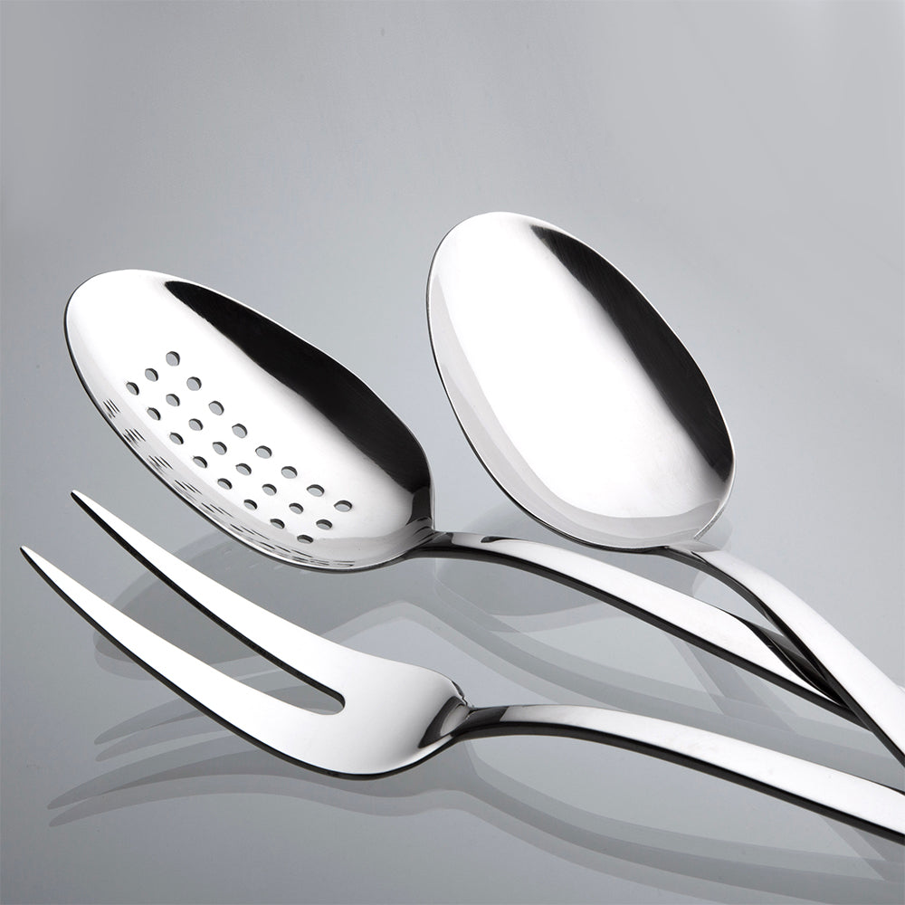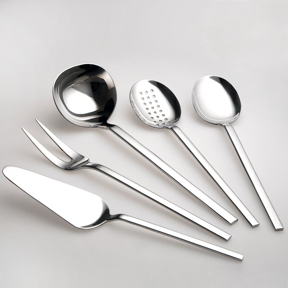 The Jumbo 8100 5 Piece Service Set combines practicality and elegance, featuring essential kitchen utensils made from durable stainless steel. This set includes a serving spoon, skimmer, fork, shovel, and ladle, each designed for ergonomic comfort and ease of use. With its minimalist design and shiny surface, this service set not only meets your culinary needs but also enhances your dining experience.