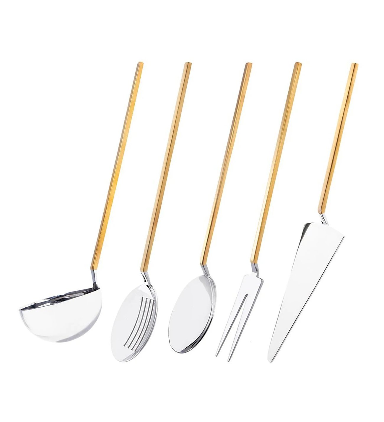 The Jumbo 9100 5 Piece Gold Serving Set is an elegant addition to any dining experience. Crafted from high-quality stainless steel with a luxurious gold finish, this set includes a serving fork, serving spoon, cake shovel, soup ladle, and food skimmer, each designed for durability and style. Perfect for both casual and formal occasions, this serving set enhances your table presentation.