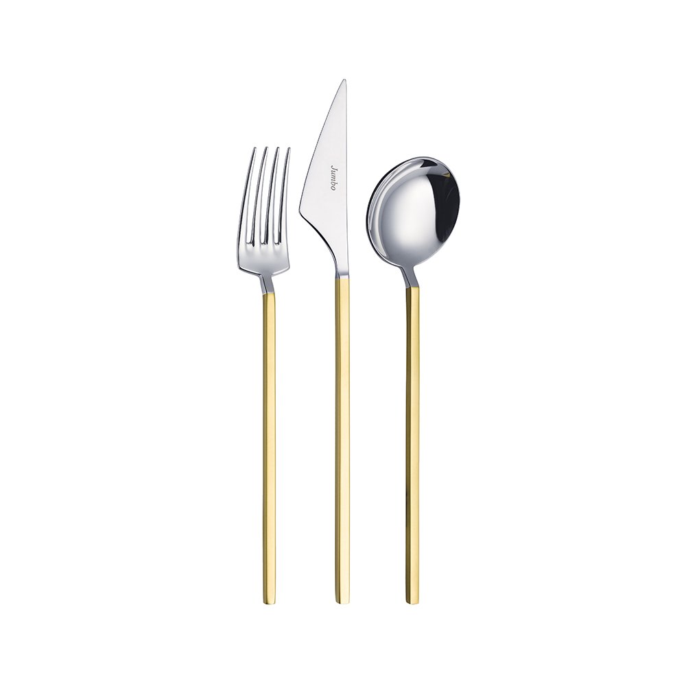 The Jumbo 9100 Matte Gold Cutlery Set for 12 people is a stunning addition to any dining experience. With its unique design and minimal lines, this 84-piece set combines elegance and functionality, making it perfect for both everyday use and special occasions. Crafted from durable stainless steel, it features a sophisticated matte gold finish that will impress your guests and elevate your table setting.