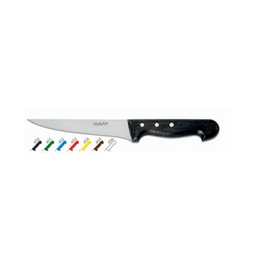 The Kapp Boning Knife features a 12.5 cm stainless steel blade, designed for precision and control in the kitchen. Its ergonomic green handle ensures a comfortable grip, making it ideal for professional chefs and culinary enthusiasts alike. This knife is perfect for deboning meat and trimming fat, enhancing your kitchen efficiency.