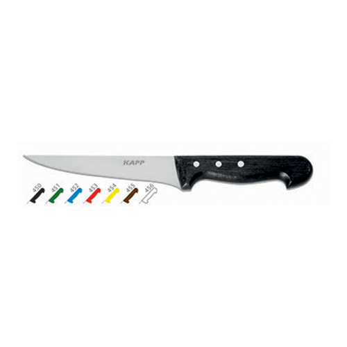 The Kapp Boning Knife features a sharp stainless steel blade measuring 16.5 cm, ideal for precision cutting and deboning tasks in the kitchen. Its ergonomic red handle ensures a comfortable grip, making it a reliable tool for chefs and culinary enthusiasts alike.