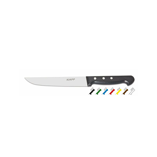 The Kapp Butcher Knife features a sharp stainless steel blade, designed for precision and durability in professional kitchens. With a comfortable blue handle, this knife ensures a secure grip while preparing meats and other ingredients. Ideal for chefs and culinary enthusiasts alike, it combines functionality with a sleek design.