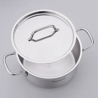 The Korkmaz Alfa Pot is crafted from high-quality 18/10 Cr-Ni stainless steel, featuring a three-layer triplex capsule base for optimal heat distribution. Its extra thick handles and knobs ensure safety while cooking, and the polished exterior maintains a brilliant shine. Designed for convenience, this pot is induction compatible and dishwasher safe, making it an ideal choice for any kitchen.