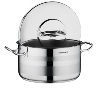 The Korkmaz Astra2 Pot is designed for efficiency and convenience, featuring a spacious 15-liter capacity and dimensions of 32x19 cm. Its flat lid allows for easy stacking and minimizes space in the dishwasher. The innovative Solar Base system ensures optimal heat transfer across all stove types, including induction, providing significant time and energy savings.