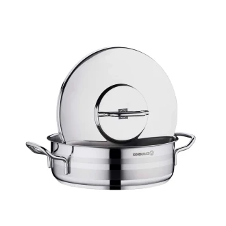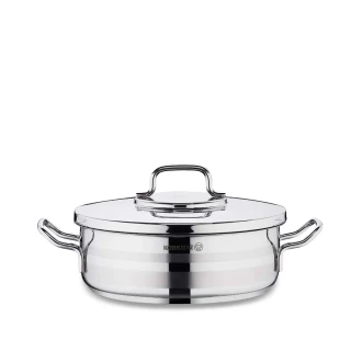 The Korkmaz Astra2 Short Casserole is designed for efficiency and convenience, featuring a flat lid for easy stacking and space-saving in the dishwasher. Its innovative Solar Base system ensures optimal heat transfer across all stove types, including induction, providing significant time and energy savings during cooking.