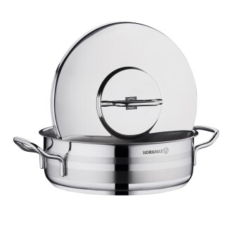 The Korkmaz Astra2 Short Casserole is designed for efficiency and convenience, featuring a flat lid for easy stacking and optimized space in dishwashers. Its Solar Base system ensures superior heat transfer across all stove types, including induction, providing maximum time and energy savings during cooking.
