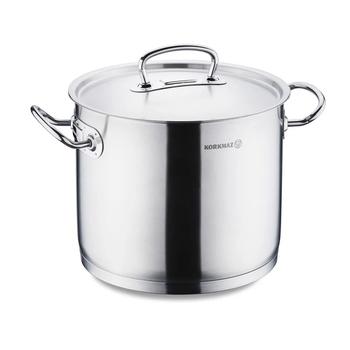 The Korkmaz Proline 28x24 cm Extra Deep Pot is designed for both professional chefs and home cooks. Made from high-quality 18/10 Cr-Ni stainless steel, it features a super capsule base for efficient heat conduction and ergonomic handles for easy handling. This pot is induction compatible and designed to maintain temperature for extended periods, making it ideal for various cooking tasks. Its durable construction ensures longevity and ease of cleaning, as it is dishwasher safe.