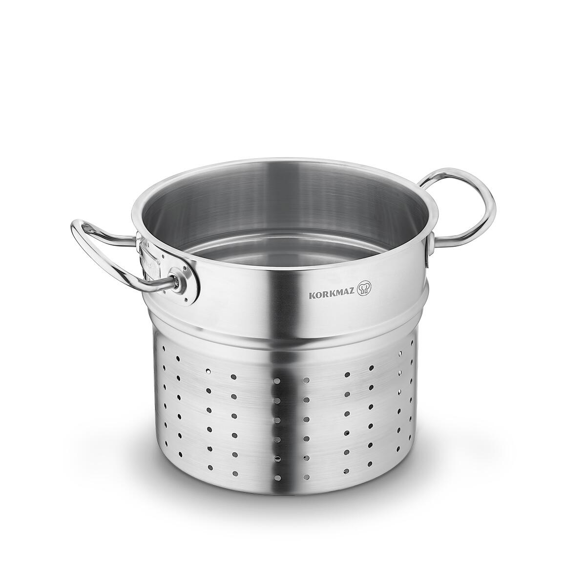 The Korkmaz Proline Satin Spaghetti Apparatus is designed for effortless cooking and straining of pasta and boiled foods. Made from durable 18/10 Cr-Ni stainless steel, it features ergonomic, hand-friendly handles for safe and easy use. This one-piece apparatus is dishwasher safe, ensuring convenient cleaning and maintenance.
