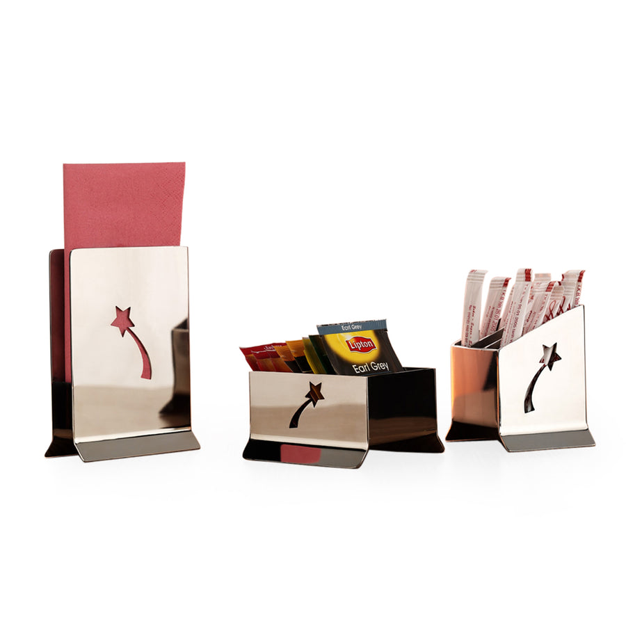 This versatile Napkin Holder & Tea Bag & Sugar Bowl is an essential addition to any dining table or café setting. Crafted from durable stainless steel, it combines functionality with a sleek design, making it perfect for both casual and formal occasions. Keep your napkins, tea bags, and sugar packets organized and easily accessible for your guests.