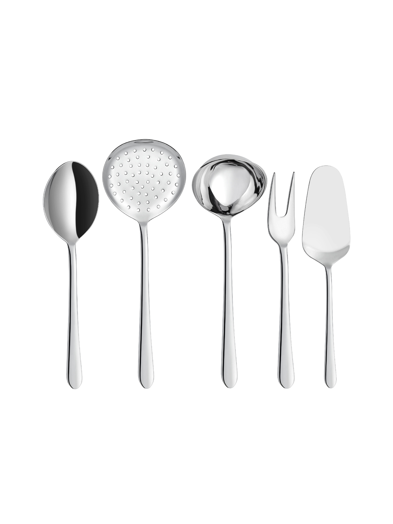 The Plaides Serving Set by WMF includes five essential serving utensils crafted from high-quality 18/10 Cr-Ni stainless steel. This set features a serving ladle, colander, spoon, fork, and spatula, all designed for durability and corrosion resistance. Ideal for both professional and home kitchens, these utensils are dishwasher safe and come with a 25-year warranty against manufacturing defects.