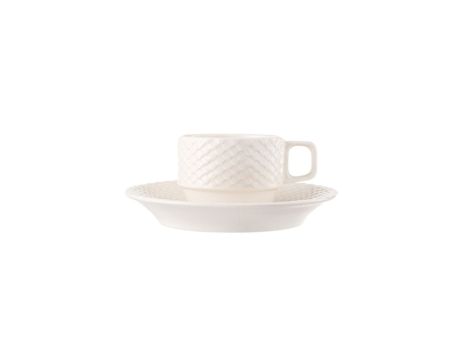 The Porland Aqua Alumilite Saucer Tea Cup set features an elegant design that reflects purity and depth. Crafted from creamy porcelain, this series showcases aesthetic reliefs that evoke the melodic rhythm of mermaids, making it a perfect addition to elevate the elegance of any dining occasion.