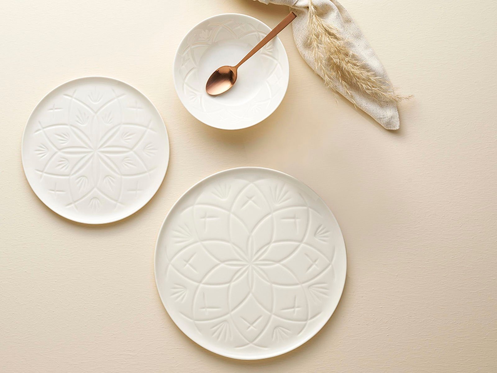 The Porland Christina 3 Piece Single Dinner Set combines modern and retro elegance, crafted from high-strength Alumilite. This collection features a unique design with decorative feet that harmonize with the relief patterns on each piece, making it suitable for both professional and home use. With its thin profile and various color options, the Christina set adds a stylish touch to any dining experience.