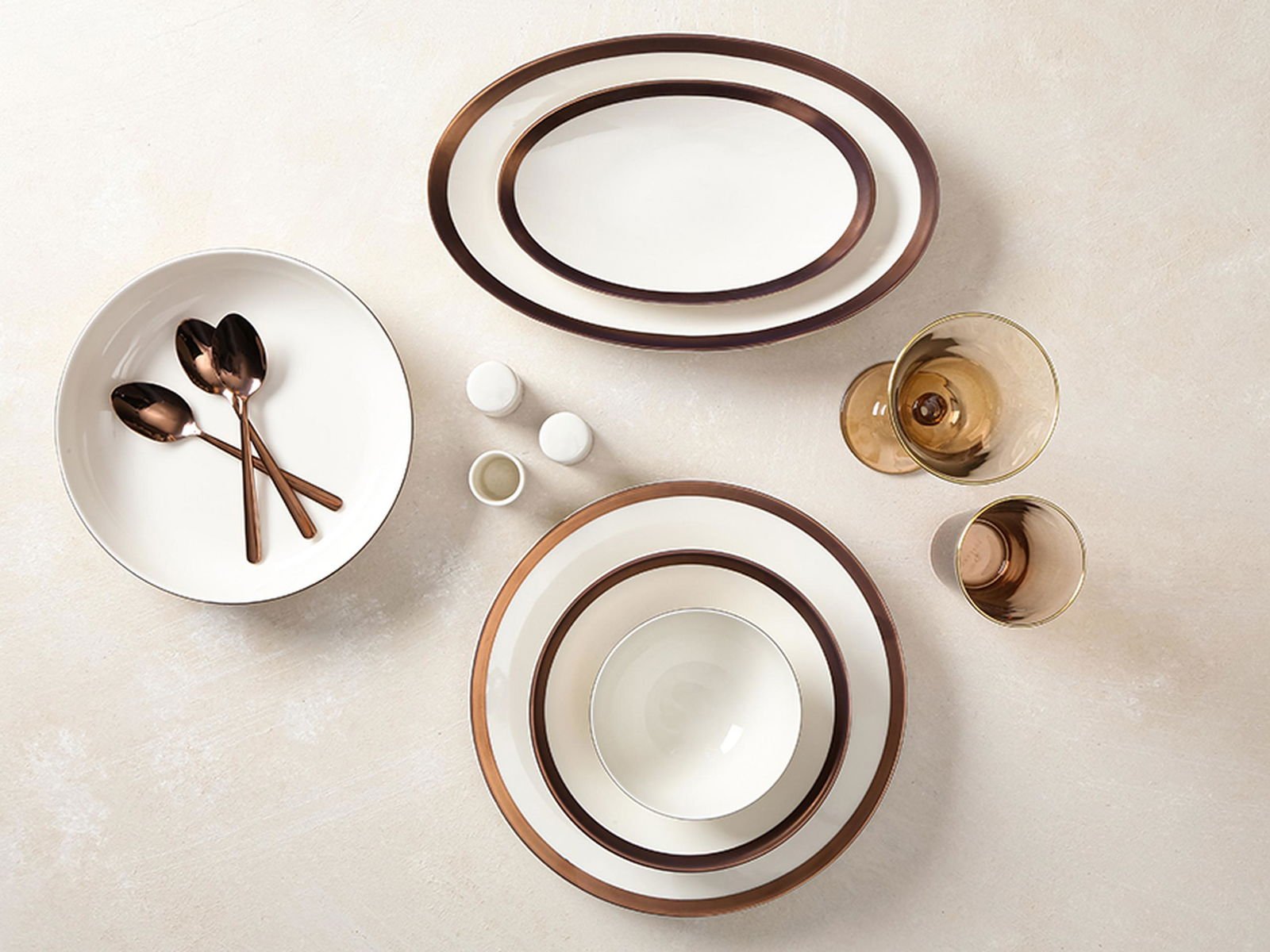 The Porland Copper Line 60 Piece Dining Set is a stunning blend of minimalist design and handcrafted elegance. This dining set, suitable for 12 people, features a variety of items including flat plates, deep plates, bowls, mugs, and tea and coffee cups, all crafted from Alumilite porcelain. The copper color adds a stylish touch, making it a perfect choice for both everyday use and special occasions.