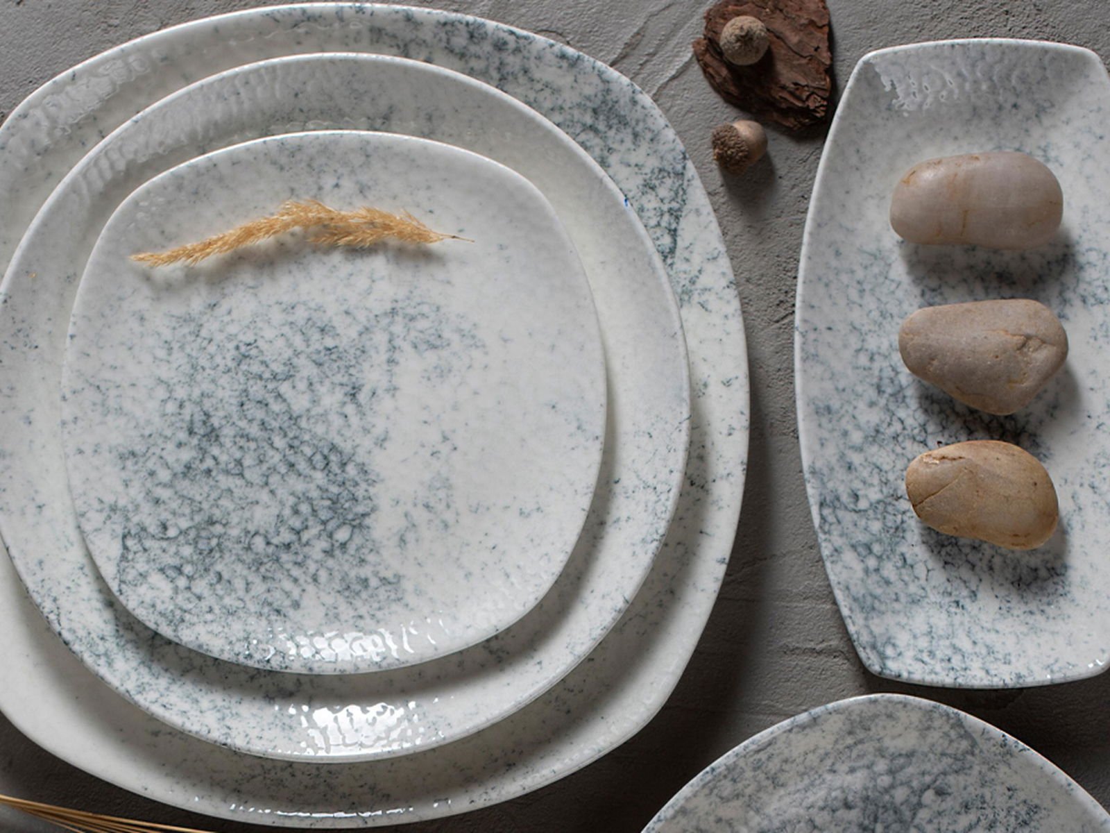 The Ethos Collection by Porland is crafted with meticulous attention to detail using unique Alumilite material. This 27-piece dinner set for six features a smoky effect with its special texture and gray-white colors, drawing inspiration from nature. Combining elegance and durability, the Ethos Smoky Collection adds a distinctive style to your dining experience.