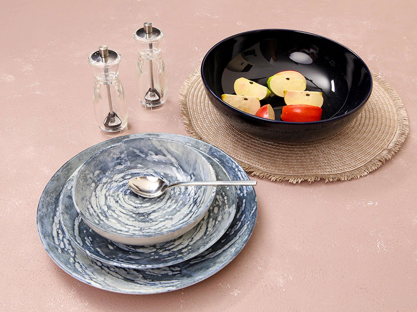 The Porland Ethos Vortex 4 Piece Single Dinner Set is crafted with meticulous attention to detail using Porland's unique Alumilite material. Inspired by the waves of the sea, this collection features captivating navy blue tones and hypnotic patterns that bring elegance and durability to your dining experience. The Ethos Collection offers various pattern alternatives, making it a perfect choice for any table setting.