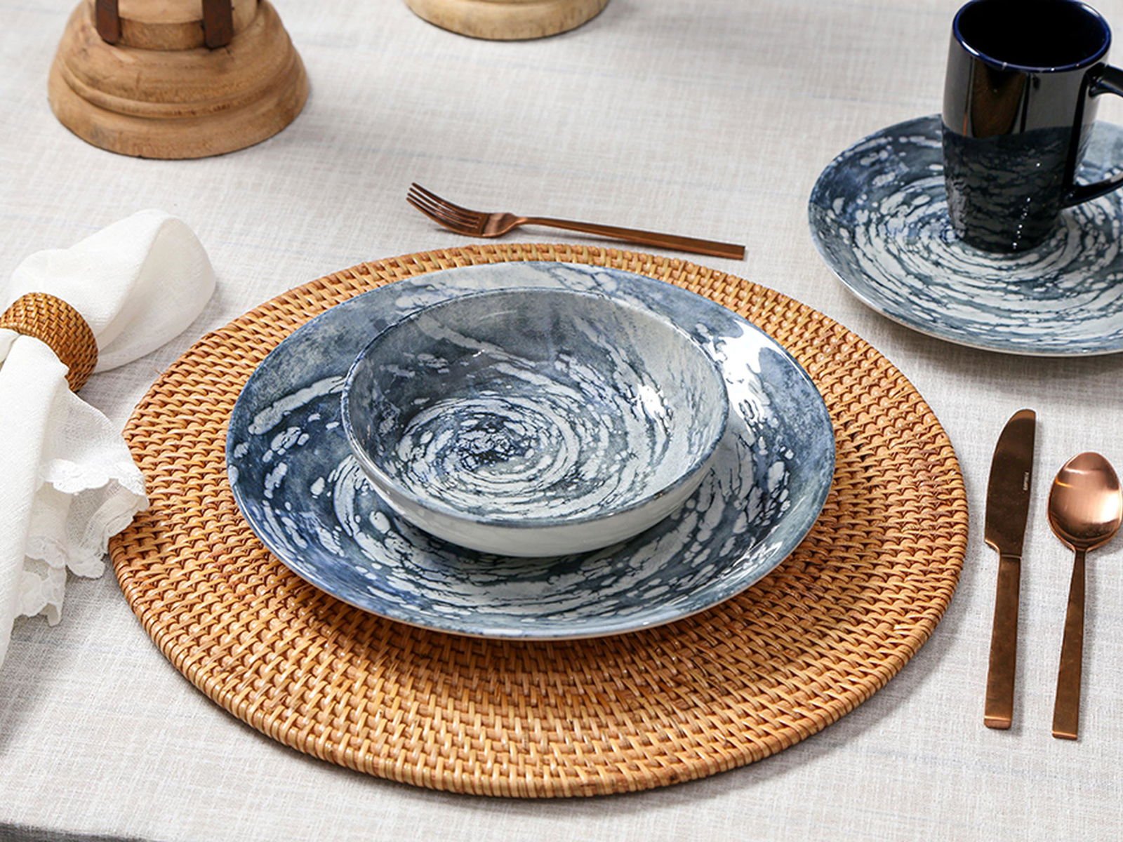 The Porland Ethos Vortex 4 Piece Single Dinner Set showcases the unique Alumilite body, crafted with meticulous attention to detail. Inspired by the waves of the sea, the Vortex collection features captivating navy blue tones and hypnotic patterns that bring elegance and durability to your dining experience. Perfect for impressing guests, this dinner set combines aesthetic appeal with practical functionality.