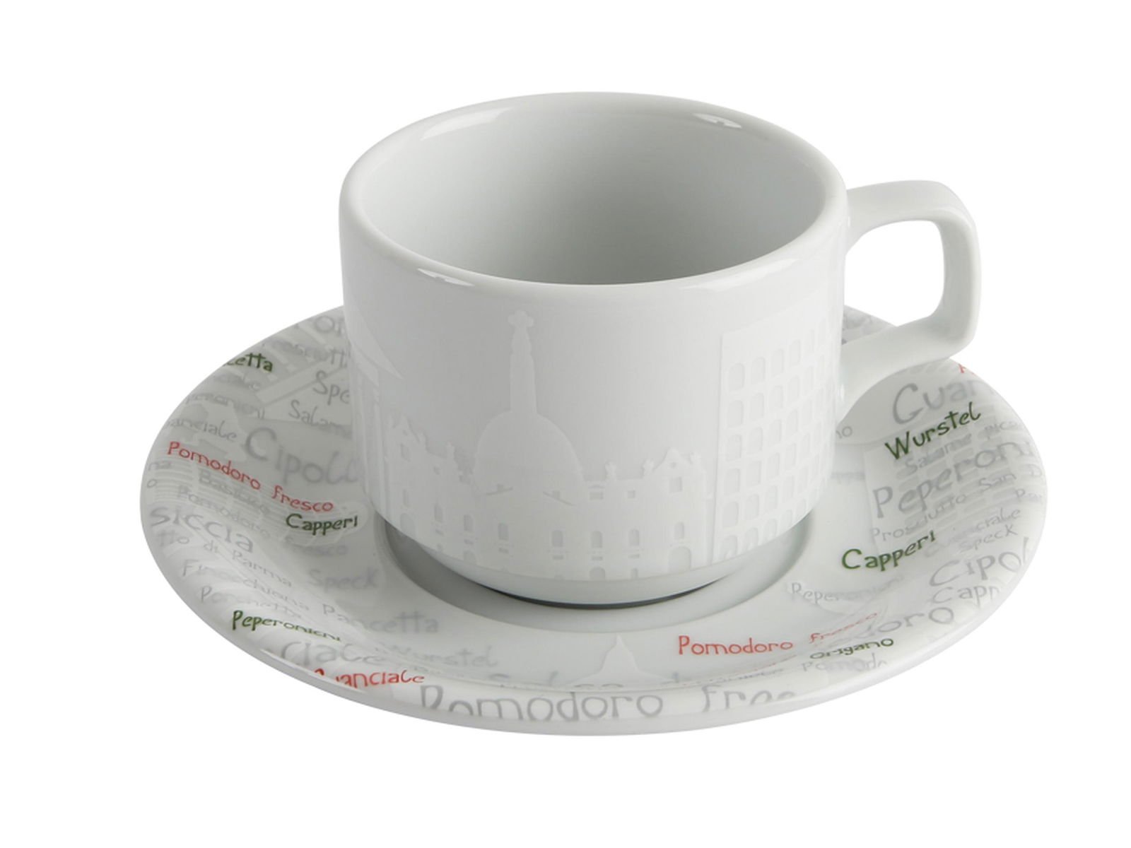 The Porland Italy Teacup with Saucer set features a charming Italian style, inspired by the vibrant colors of the Italian flag. This collection beautifully showcases the textures reminiscent of Italy's rich history, making it a perfect addition to any dining experience. Each piece is crafted from high-quality ceramic, ensuring durability and elegance for serving your favorite beverages.