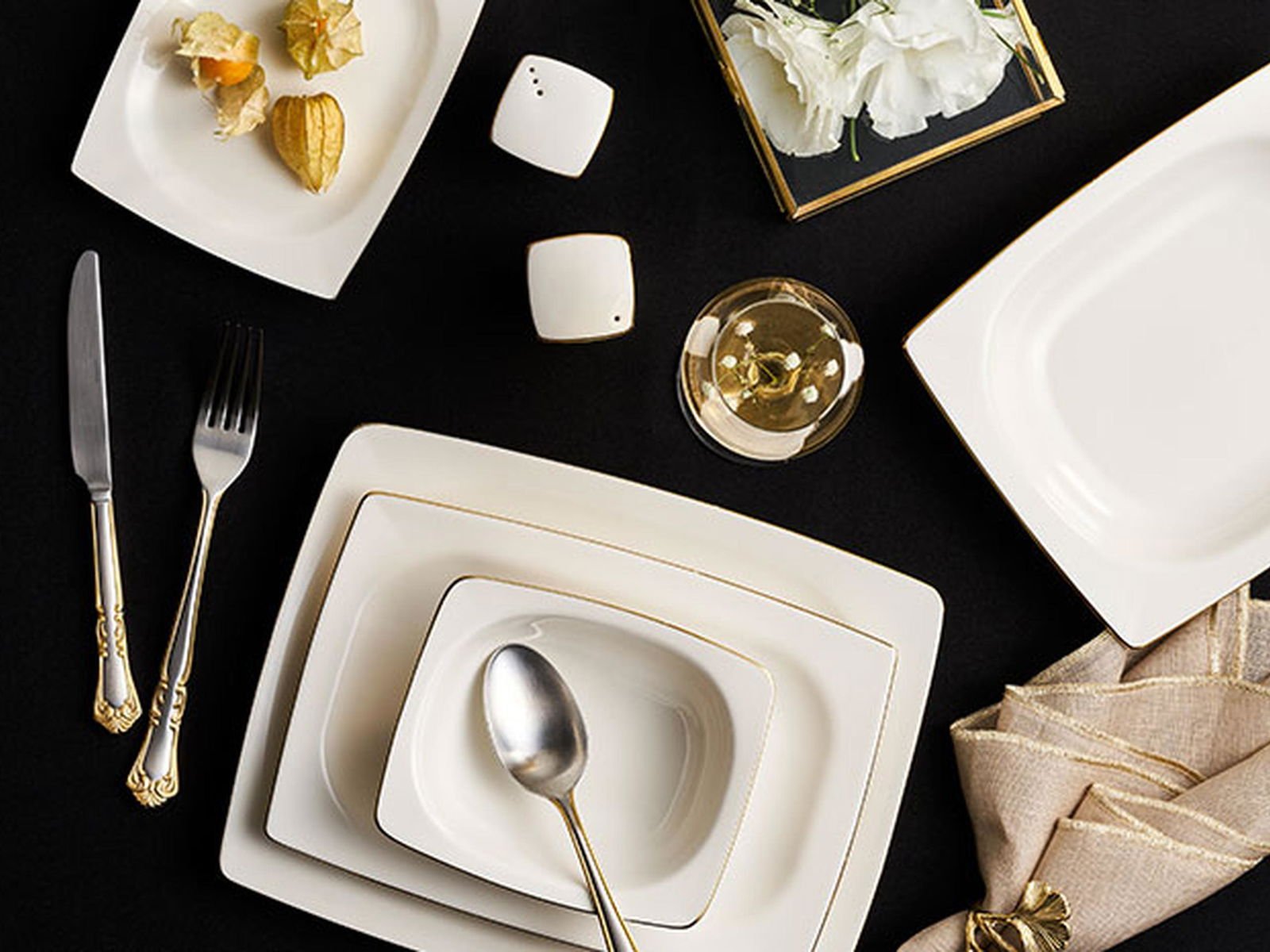 The Porland Riva Gold Gilding 57 Piece Dinner Set is a stunning collection designed for 12 people, perfect for extraordinary banquets. Its unique design draws attention with a bold stance, representing prestige and sophistication. The Riva series evokes power and prosperity, making it an exceptional choice for any upscale dining experience.