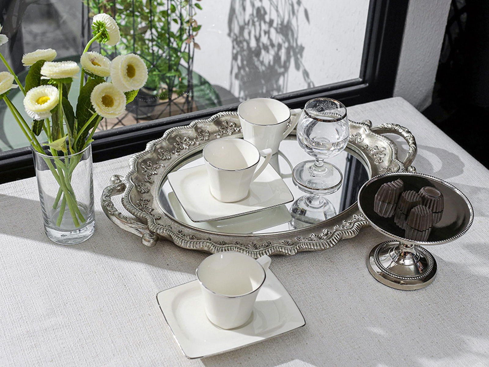 The Porland Riva Platinum Coffee Set is designed to impress with its unique and bold stance. This prestigious collection embodies power and prosperity, making it an exceptional choice for extraordinary banquets and gatherings. Each piece in the set is crafted from high-quality porcelain, ensuring durability and elegance for any occasion.