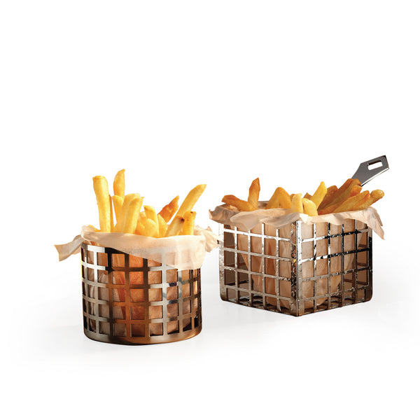 Elevate your food presentation with the Potato Basket featuring a square handle. Ideal for serving hamburgers and french fries, this stylish basket enhances the visual appeal of your dishes. Crafted with a durable stainless steel body and finished with a Titanium PVD Coating, it is available in elegant colors such as copper, gold, and rainbow, ensuring a sophisticated touch to your dining experience.