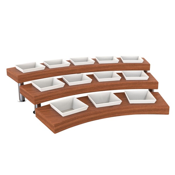 The Presentation Bow Wooden 3 Pieces set is designed for versatile food presentation, accommodating items like corn flakes, fruits, olives, jams, and sauces. Its innovative spring-shaped design enhances organization and space efficiency in buffets. Crafted for durability and ease of cleaning, this set can be purchased in various configurations, allowing you to create a customized display. Note that porcelain items are sold separately.