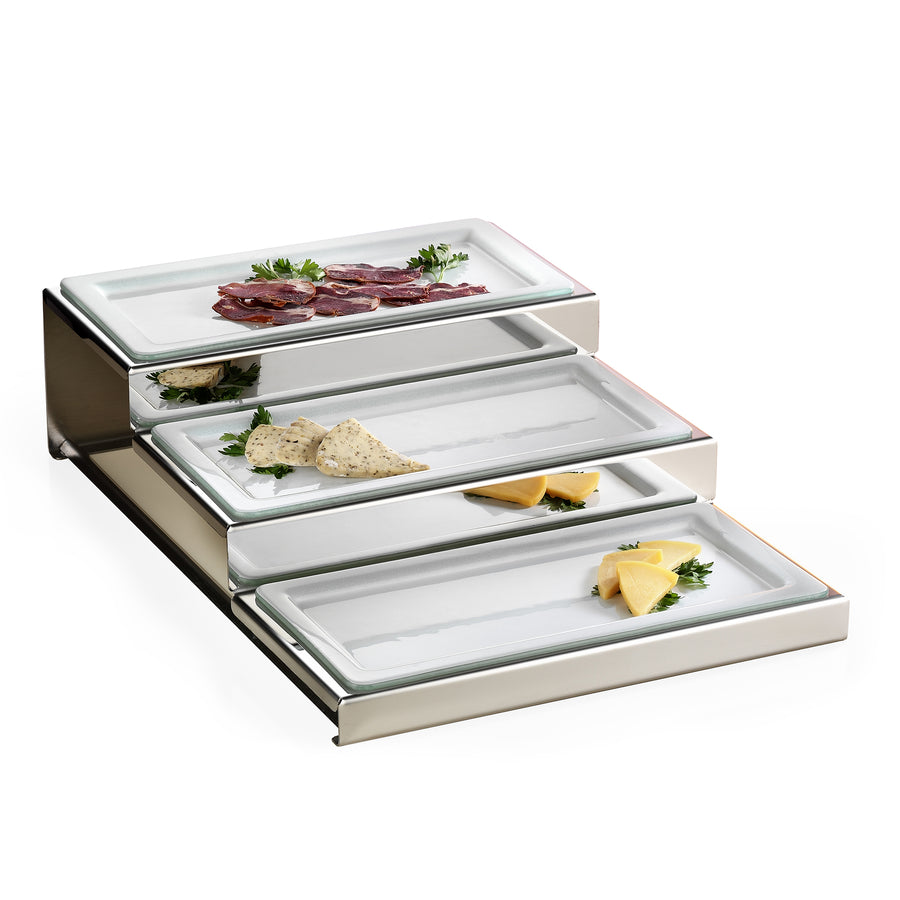 The Presentation Stand 3 Tiers 3 Slots features a ladder model and multi-layered structure, providing a practical solution for serving a variety of foods. Ideal for buffets and catering events, this stand is designed to enhance your presentation. Glassware is not included and can be purchased separately. Available in multiple color options with a durable Titanium PVD Coating for added peace of mind.