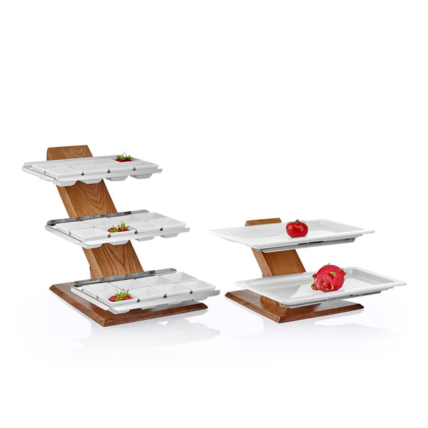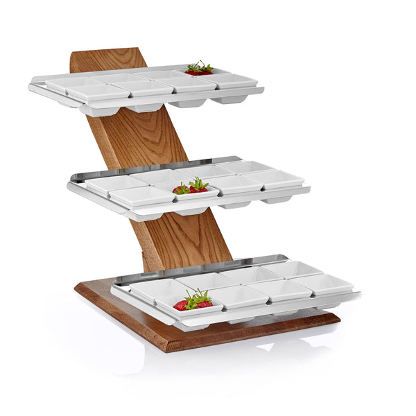 The Shelf Sea 3 Floor 24 Slot Wooden presentation stand is designed for showcasing a variety of items such as cheese, salami, pastries, yogurt, jams, and olives in open buffets. Constructed with a sturdy wooden body and stainless steel shelves, this stand is both functional and stylish. It offers a choice of Titanium PVD Coating in gold, copper, or rainbow colors for added elegance.