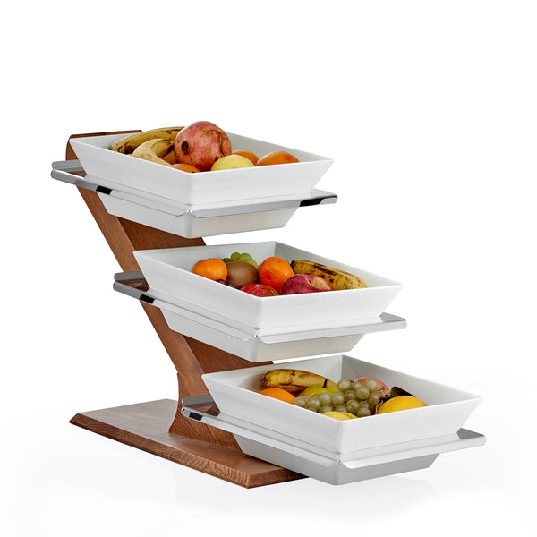 The Shelf Sea 3 Floor 3 Slot Square Wood is an ideal solution for showcasing salads and fruit varieties in open buffets. Crafted with a sturdy wooden body and stainless steel shelves, this display unit offers both durability and elegance. Please note that melamines are sold separately, allowing you to customize your setup. The metal parts can be finished with Titanium PVD Coating in gold, copper, or rainbow colors for a unique touch.