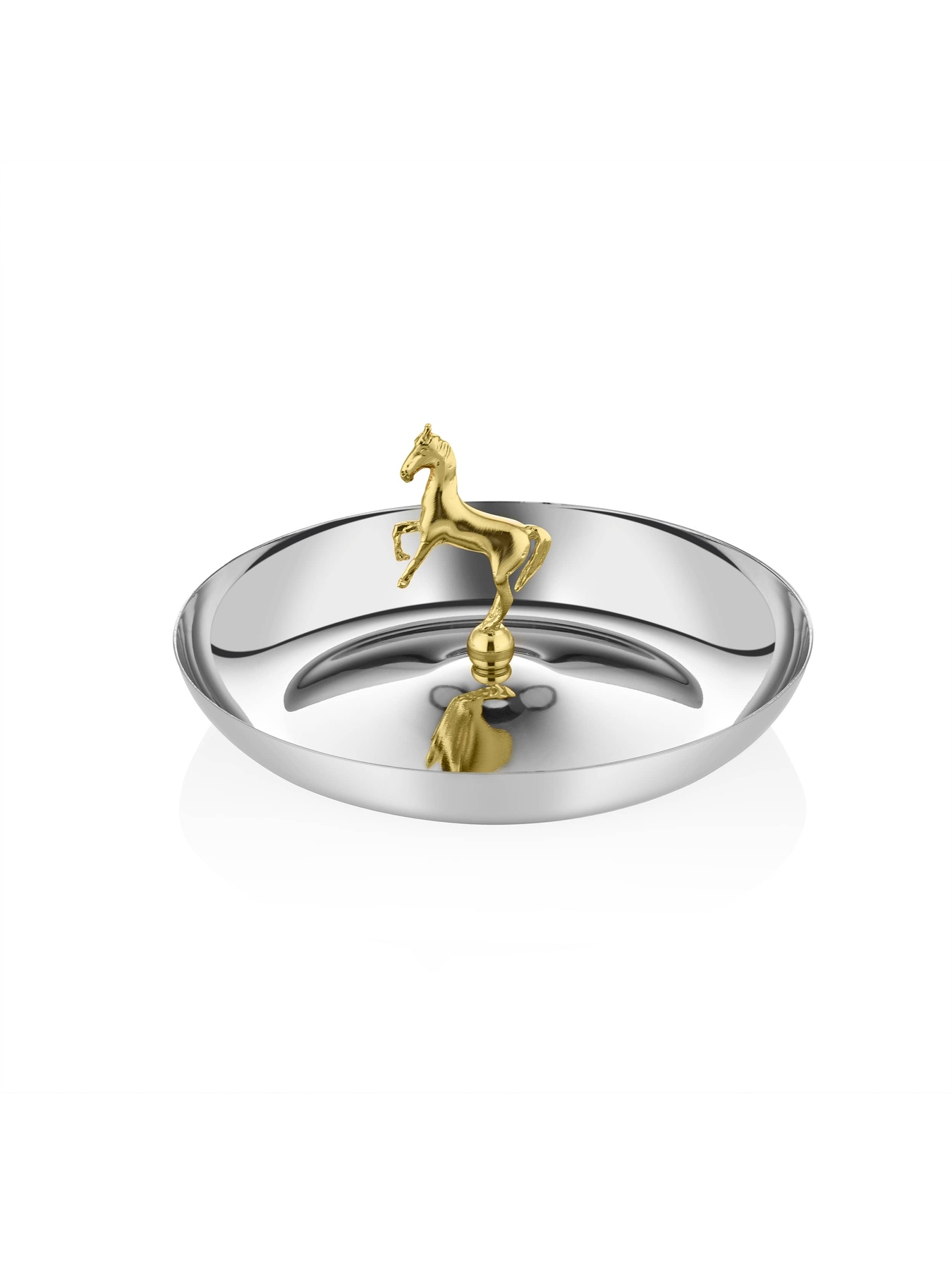 The Sphera Plate - Horse Figured is crafted from high-quality 18/10 Cr-Ni stainless steel, ensuring durability and resistance to corrosion. With a diameter of 13 cm, this plate is perfect for serving appetizers or desserts. For best care, hand washing is recommended to maintain its elegant finish.