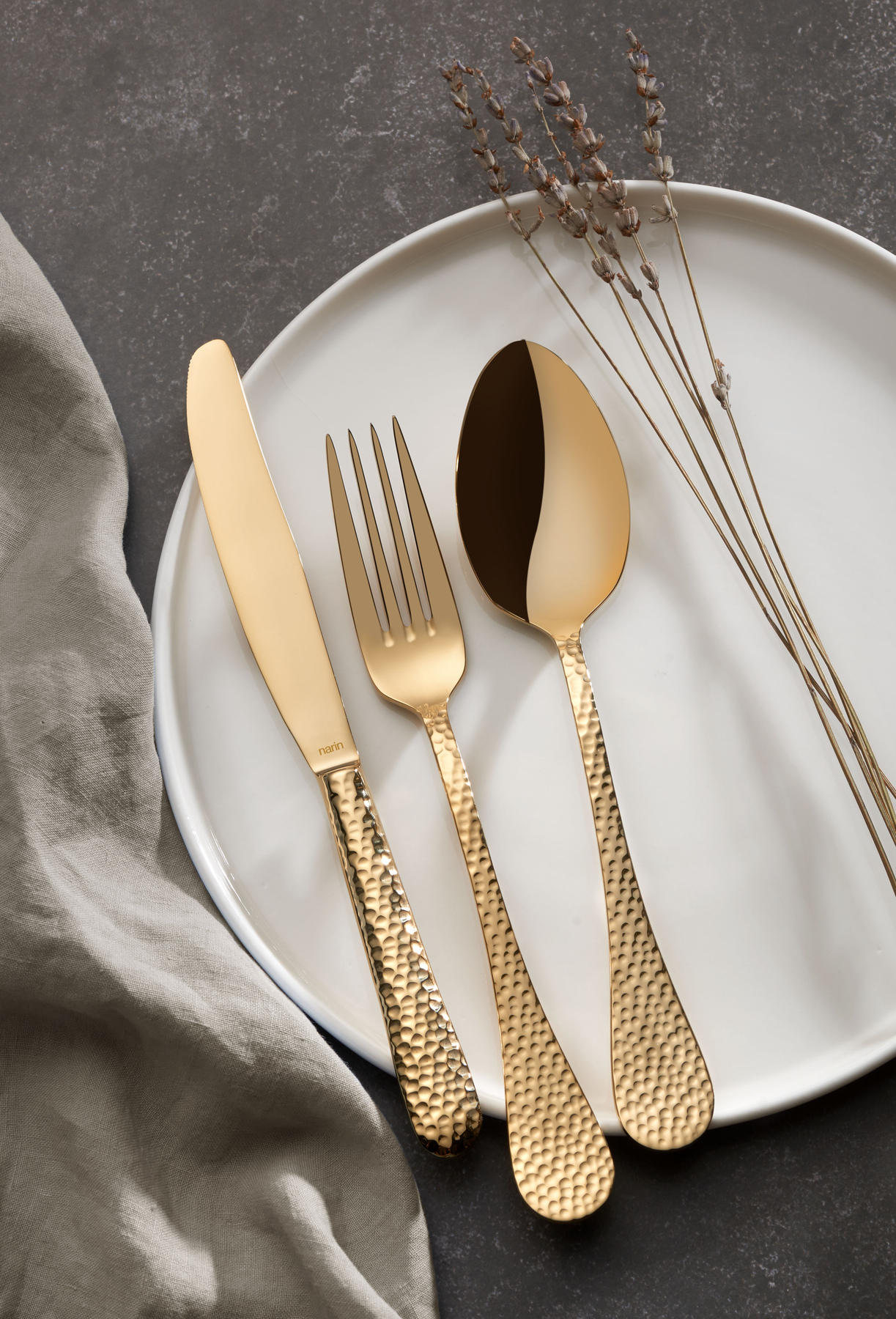 The Tattoo Series - Gold Titanium cutlery set includes 42 elegantly designed pieces, perfect for enhancing the dining experience in any upscale restaurant or hotel. Crafted from high-quality stainless steel and coated with luxurious gold titanium, this set combines durability with a stunning aesthetic. Ideal for both formal and casual dining settings, the Tattoo collection is sure to impress your guests.
