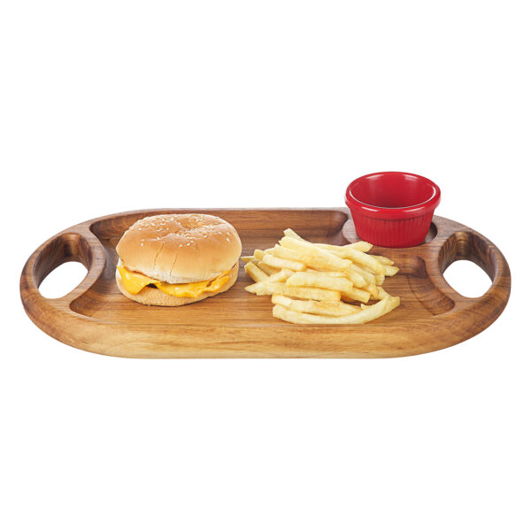 The Walnut Hamburger Presentation tray is designed to elevate your food presentation, making it perfect for restaurants and cafes. Crafted from high-quality wood, this tray features a stylish walnut finish that complements any dining setting. Its generous dimensions of 35x20 cm provide ample space for serving burgers alongside sauces, ensuring an appealing and organized presentation.
