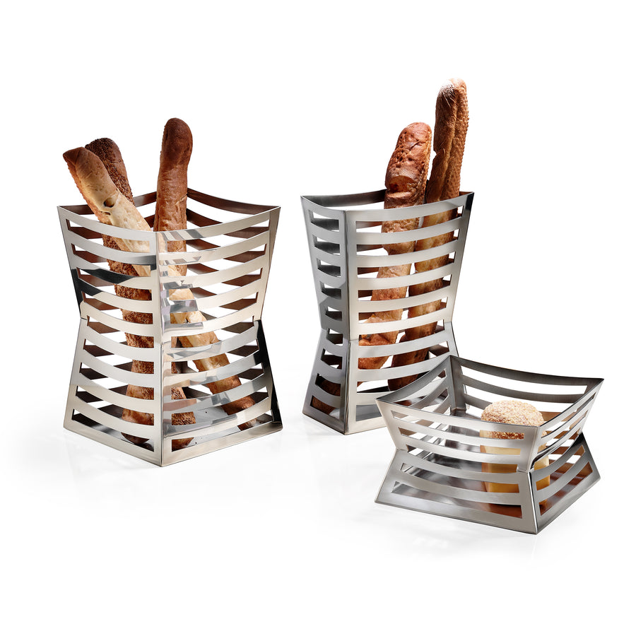 The X Baguette Bread Holder is designed to enhance your bread buffets with its stylish appearance. Made with a durable Titanium PVD Coating, it offers a luxurious finish available in gold, copper, and rainbow options. This holder not only provides a comfortable place for your baguettes but also adds a touch of elegance to your dining presentation.